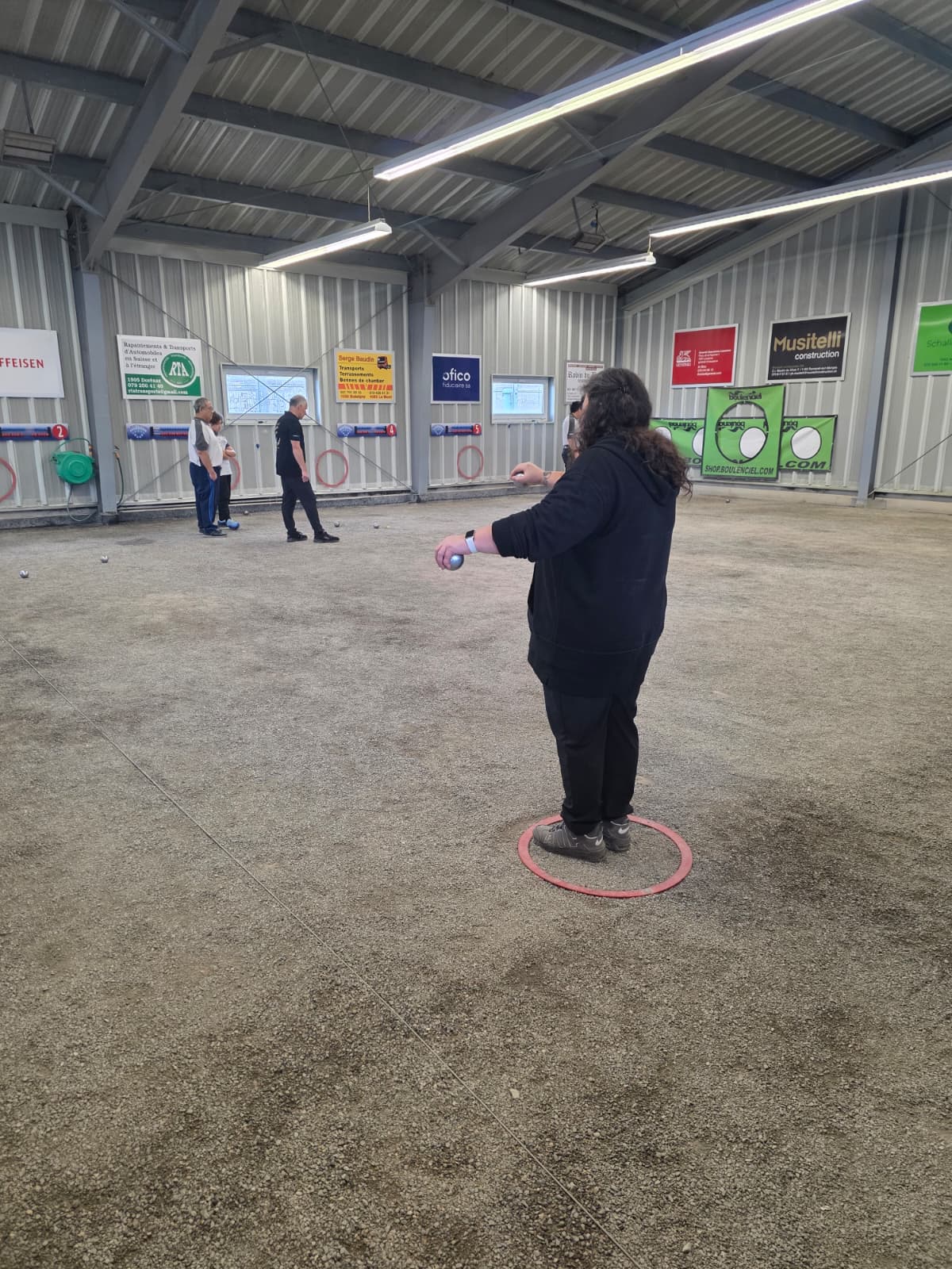 La triplette mixte associe Véronique, Dan et Philippe. Dans l’autre équipe nous retrouvons Patrick Christian et Laurent.